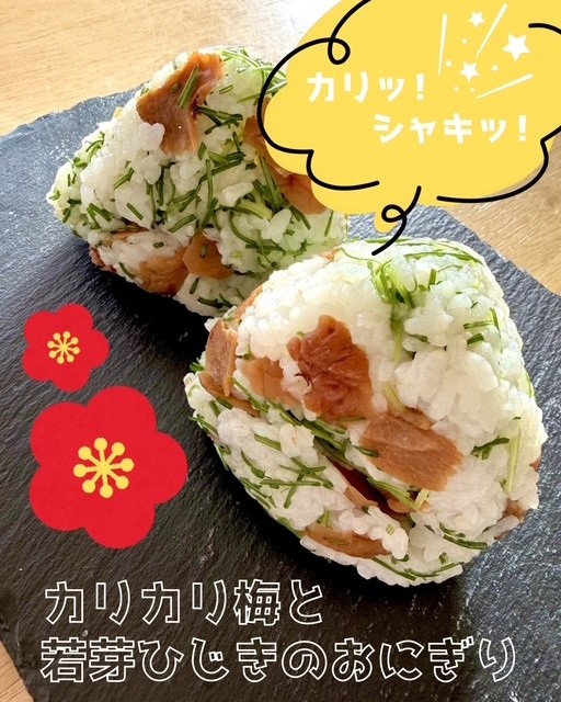 若芽ひじきを茹でずに刻んでシャキシャキ触感とカリカリ梅のカリカリ触感を活かしたおにぎりを作ってみました🍙💗