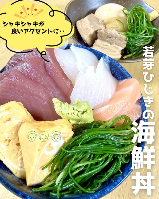 若芽ひじきのさっぱりとした味わいと生魚の相性がバッチリな海鮮丼です🐟✨